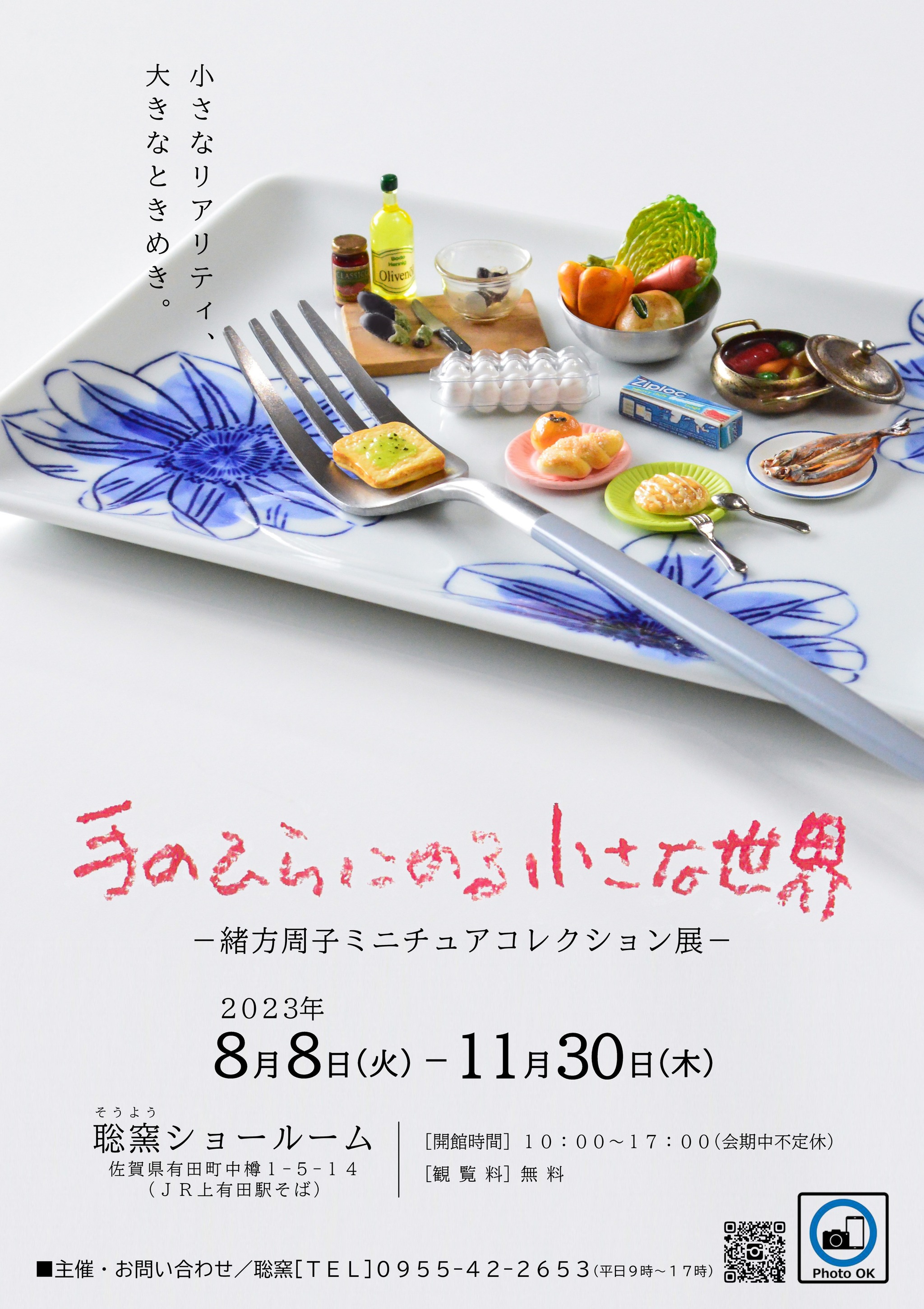 この度、聡窯では『手のひらにのる世界 -緒方周子ミニチュアコレクション展-』を開催します。緒方周子氏は、有田で数年間陶技を学ばれた後、ご自宅の福岡県筑後市に工房を構え作陶の傍ら、様々な素材、形のミニチュアを50年に渡り収集されてきました。本展では、緒方氏の所蔵コレクションの一部ではありますが、特にご覧いただきたいと厳選しました貴重な作品の数々をお借りし、広く公開。3ヶ月半に及ぶ長期開催となっております。手のひらにのる小さなミニチュアの世界を、どうぞお楽しみください。